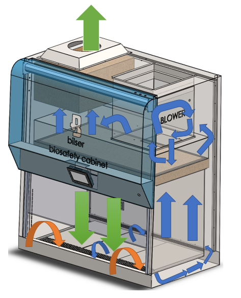 - Cihaz dikey akımlı laminar hava akışına sahiptir, çalışma alanı içinde gerçek laminar akım şartları sağlanmakta, sistem hiçbir şekilde türbülans oluşumuna izin vermemektedir. Kabin ön cam açıklığından alınan hava ile kabin çalışma alanı içinden emilen toplam havanın yaklaşık %30’u ana HEPA filtreden süzülüp dikey olarak tekrar çalışma alanına üflenirken, yaklaşık %70’i egzos HEPA filtresinden süzülerek dış ortama atılmaktadır. Kontaminasyon riski olan hava kanalları negatif basınçla çevrilmiş, böylece çalışma alanına giden havaya partikül karışması önlenmiştir. Cihazdaki negatif basınç hava sızıntısını engeller. Cihazın içeri akış hızları asgari 0,25-0.50 m/s değerlerini karşılar.